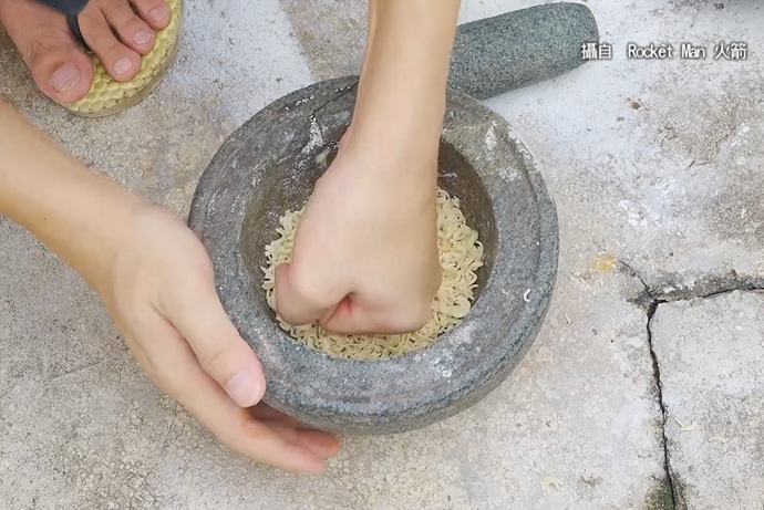 Rocket Man 火箭:「你們覺得今天這個泡麵刀會成功嗎,好,這個就是今天我用泡麵做的一把刀,就是這樣。」