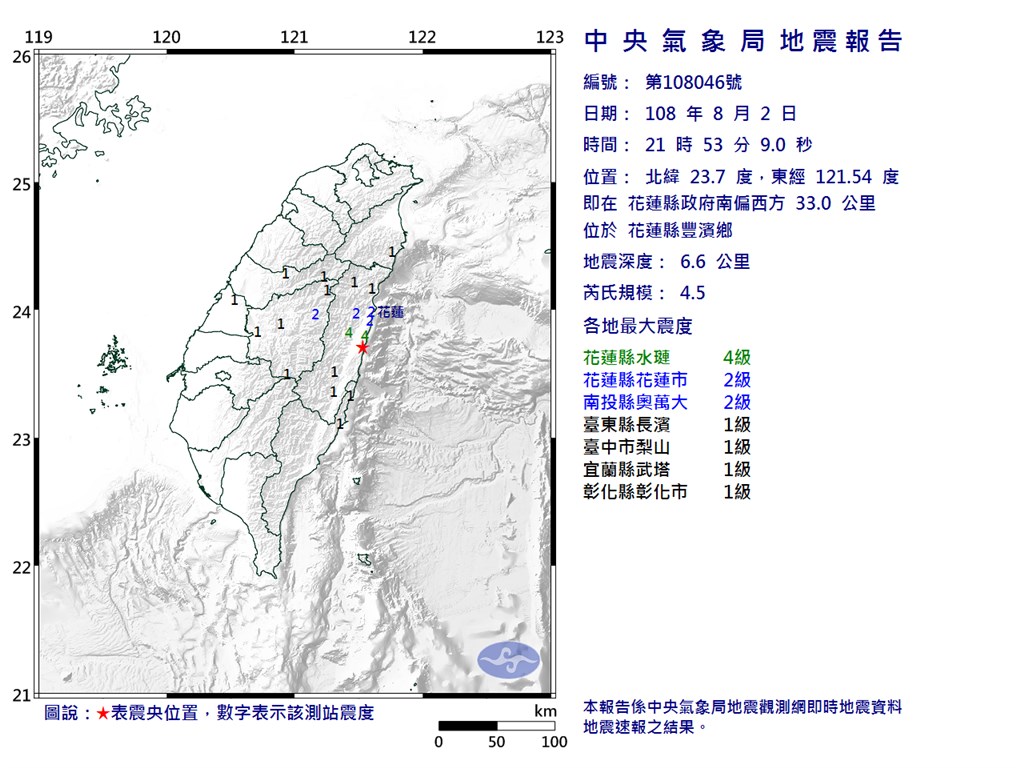 有地震!根據中央氣象局,今(2)晚9時53分發生芮氏規模4.5地震,地震深度6.6公里,震央位於花蓮縣政府南偏西方33.0公里(位於花蓮縣豐濱鄉),最大震度花蓮縣4級。