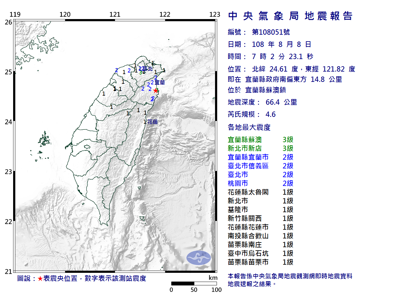 陳國昌說,這次的地震算是在預期內發生,雖然目前不清楚有沒有災損,不過對能量釋放來說是好現象,氣象局表示,如果今天這起地震是主震,那後面的餘震數量不會太多,持續的時間也不會太長,氣象局將會持續觀察,而在5點28分之後,7點02分宜蘭再度發生規模4.6地震,震央位於宜蘭蘇澳,宜蘭、新北最大震度3級,台北市、桃園市最大震度2級,花蓮縣、基隆市、新竹縣、南投縣、苗栗縣、臺中市最大震度則是1級。而這兩起地震是否有關聯?陳國昌表示,這屬於隱沒帶地震,這兩個地震是獨立的,7點02分這起地震並非前次地震的餘震。