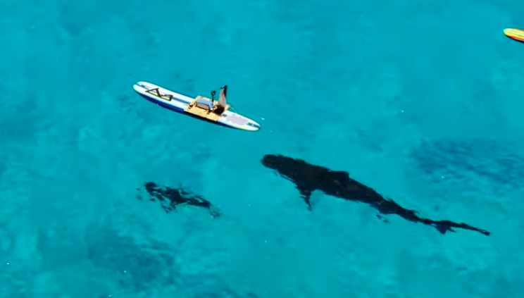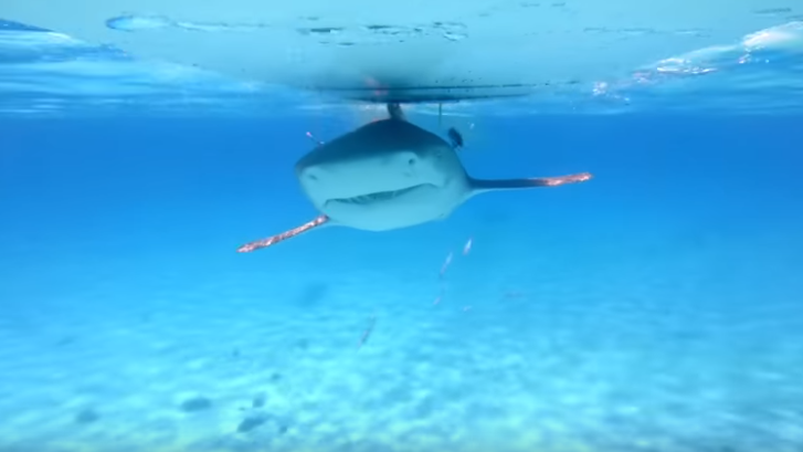 ▼鯊魚緩緩靠近衝浪板。(圖/翻攝自YouTUbe/Mark Rober)