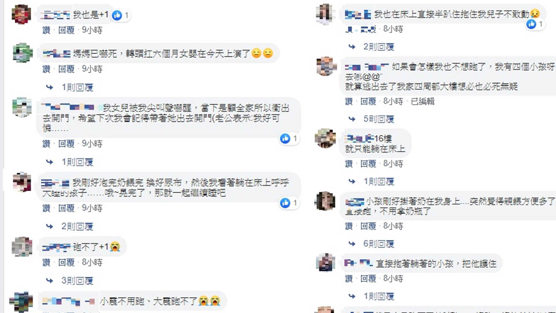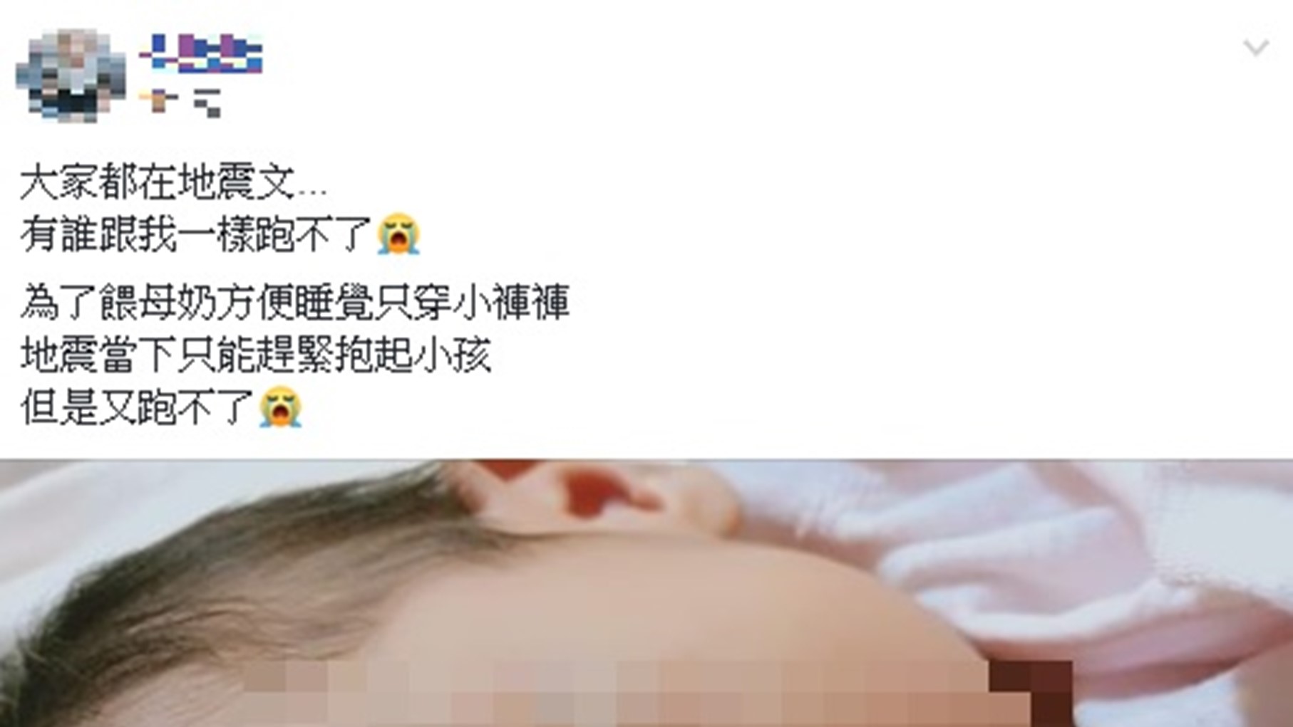 這位媽媽5點48分在臉書《爆廢公社二館》貼出一張照片,文中寫道「大家都在地震文,有誰跟我一樣跑不了」,只見女兒趴在她的腿上熟睡,再寫道「為了餵母乳方便睡覺只穿小褲褲,地震當下只能趕快起來抱小孩,但是跑不了」,文末再覆上一個哭臉。看到貼文後,很多媽媽超有共鳴,「我也在床上直接半趴住抱住我兒子不敢動」、「跑不了,只能護住孩子」、「媽媽已嚇死,轉頭扛6公斤女嬰今天上演了」。除了媽媽們有感,女網友們也熱烈留言,「我睡覺都沒穿內衣內褲,每次地震來都跑不了」、「一邊跑一邊拉棉被(只穿大T睡覺)」、「地震當時在幫老公弄早餐,表面裝沒事手在動,腦子卻在規劃等一下要抓甚麼跑才不會被看到沒穿內衣」。