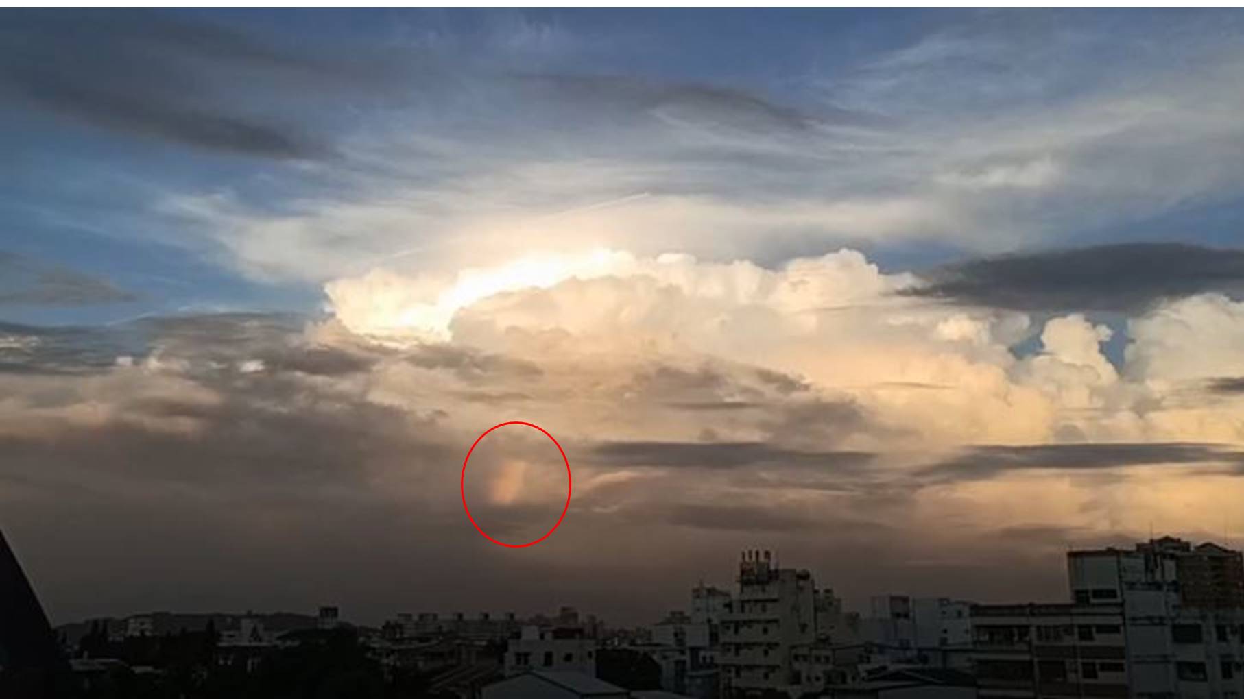 颱風前夕特殊的天氣現象不只一個,像是7號傍晚,就有民眾在花蓮吉安鄉拍下罕見的火彩虹景觀,厚厚的積雨雲中間竟然透出一道七彩光線,相當炫麗,而且還持續了二十分鐘。