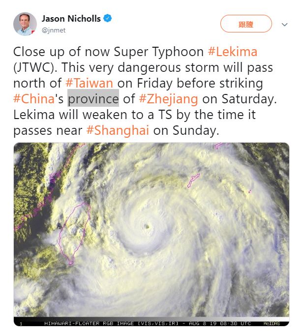強颱利奇馬替北台灣及中南部山區帶來強降雨,美國氣象機構「AccuWeather」的高級氣象學家傑森.尼科爾斯(Jason Nicholls)更形容它是「非常危險的風暴」,預測它在11日襲擊上海時強度減弱為熱帶氣旋。根據美國佛州大學(FSU)氣象研究生柯文(Levi Cowan)建立的氣象數據資料網站顯示,颱風利奇馬模擬路徑顯示,它將從福建、浙江一帶登陸後開始北上,沿途掃過安徽、上海、江蘇、山東,預計颱風中心最後從黃海出海,轉而影響朝鮮半島與日本。