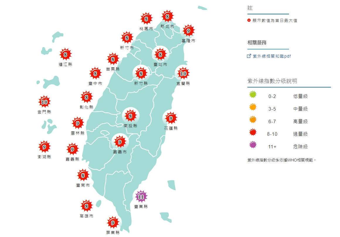 ▼全台紫外線皆過量級,台東縣甚至出現最高的「危險級」。(圖/中央氣象局)