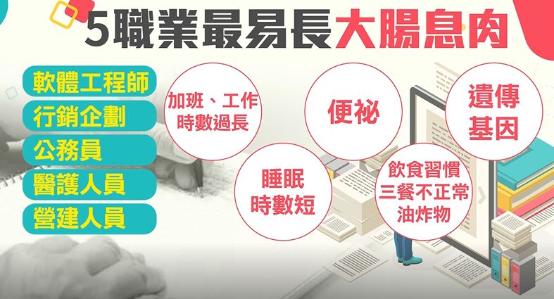 另外,象徵是大腸癌前兆的息肉,也找上特定族群,軟體工程師、行銷企劃 、公務員、醫護人員、營建人員,主因就是工作時數長,作息不穩定 ,三餐也不正常,醫生提醒盡可能還是保持健康生活狀態,才能避免大腸癌找上門。