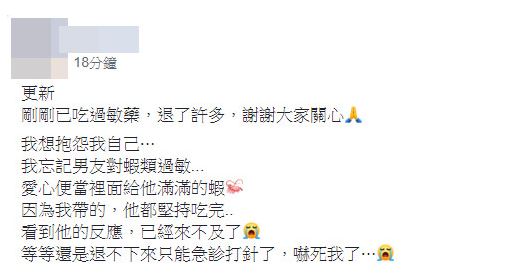 一位女網友在臉書PO文表示,她平常有幫男朋友準備便當的習慣,沒想到忘記男友對蝦子過敏,看到他滿臉紅腫才想起來,原PO對此也感到非常內疚。