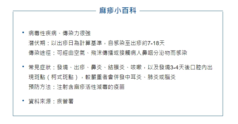 ▼疾管署20日公布,國內新增3例麻疹病例,2例為日前國泰醫院群聚案延續,該群聚已累計9人確診。(圖/取自疾管署)
