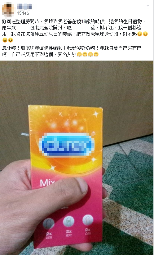 原PO在臉書社團《爆廢公社公開版》發文,可以看到他手拿一盒保險套,包裝完好如初,沒有拆封。原PO表示他剛剛在整理房間時,找到爸爸在他18歲時送他的生日禮物「保險套」一盒,「兩年來包裝完全沒開封」,剛好爸爸這星期五生日,他決定做成氣球回送給爸爸,「爸,對不起,我一個都沒用。」不過話鋒一轉,他開始抱怨爸爸,「到底送我這個幹嘛啦!我就沒對象啊!」自己只會DIY又用不到,「莫名其妙」。