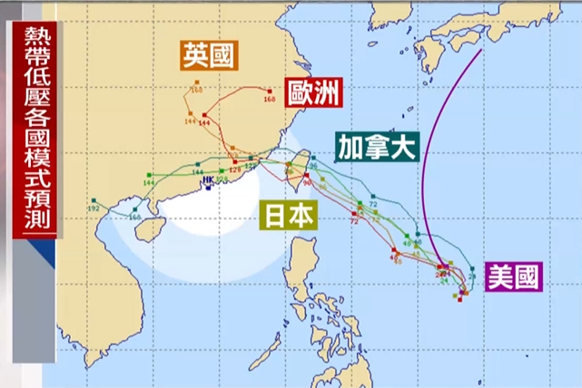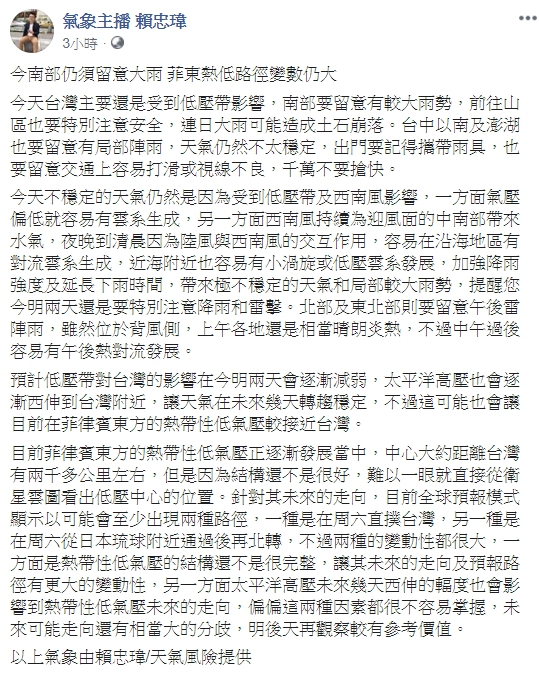 天氣風險公司天氣分析師、氣象主播賴忠瑋分析,目前菲律賓東方的熱帶性低氣壓正逐漸發展當中,因為結構還不是很好,很難以一眼就直接從衛星雲圖看出低壓中心的位置。而針對其未來的走向,目前全球預報模式顯示以可能會至少出現兩種路徑,一種是在周六直撲台灣,另一種是在周六從日本琉球附近通過後再北轉,不過兩種的變動性都很大。
