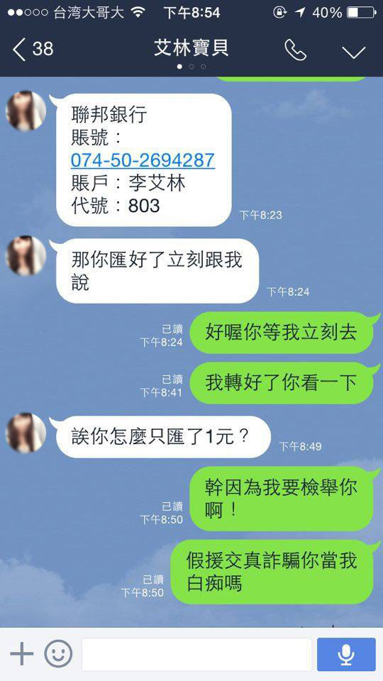 沒想到其實這名男友早就察覺有異,而且自己也並非真的想要找援交妹,在取得詐騙集團帳號後,匯了1元,對方還問說怎麼只有1元,男友神回「因為我要檢舉你啊,假援交真詐騙,當我白癡嗎?」許多人看了都說「這手法太嫩了啦!」,不過也有人說「轉帳1元,花15元手續費,不划算!」