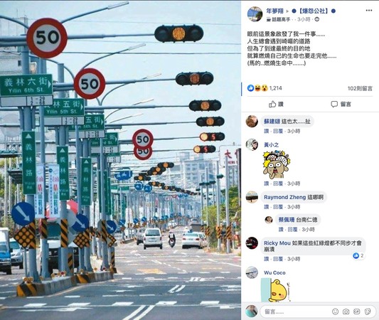 一名網友日前在臉書社團「爆怨公社」發文,「眼前這景象啟發了我一件事,人生總會遇到崎嶇的道路,但為了到達最終的目的地,就算燃燒自己的生命也要走完他(它)」,並崩潰地說自己正在燃燒生命中,從照片中能看到,義林路一整排都是黃燈號誌,紅綠燈多到看不到盡頭。