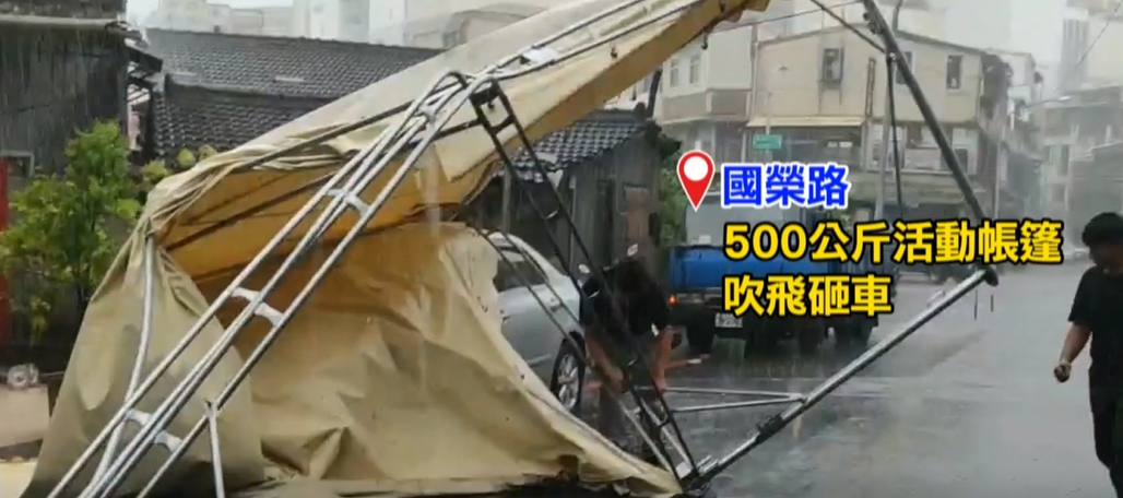 類似情況還發生在國榮路上,傾盆大雨加上一陣強風,重達500公斤的活動帳篷竟然也被吹垮,砸傷路邊車輛。