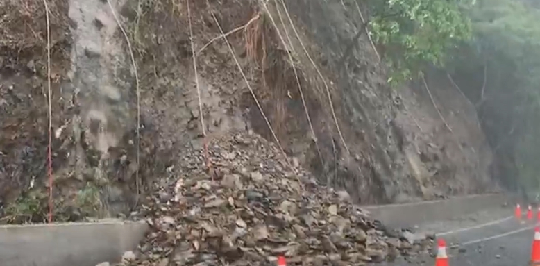 花東縱谷公路卑南龍過脈路段,大大小小的石塊從山坡上掉落到車道上,後方車輛看到急忙倒退就怕被波及,該路段持續有落石的現象,等待風雨漸小,工程人員才會進行搶修,提醒路過的民眾要特別注意。