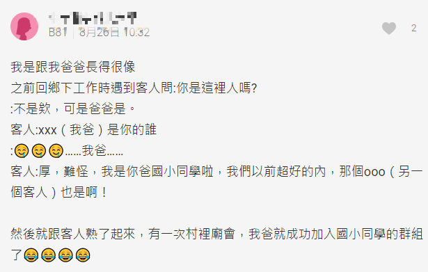 文一發出,引來了許多網友跟著直呼「太狂了」、「小孩不能偷生」、「好想看照片」,也有許多網友留言表示自己也跟自家爸媽長得很像,一位女網友表示自己跟爸爸長得很像,有一次她還把自己的照片認錯成是爸爸,被媽媽笑了很久。