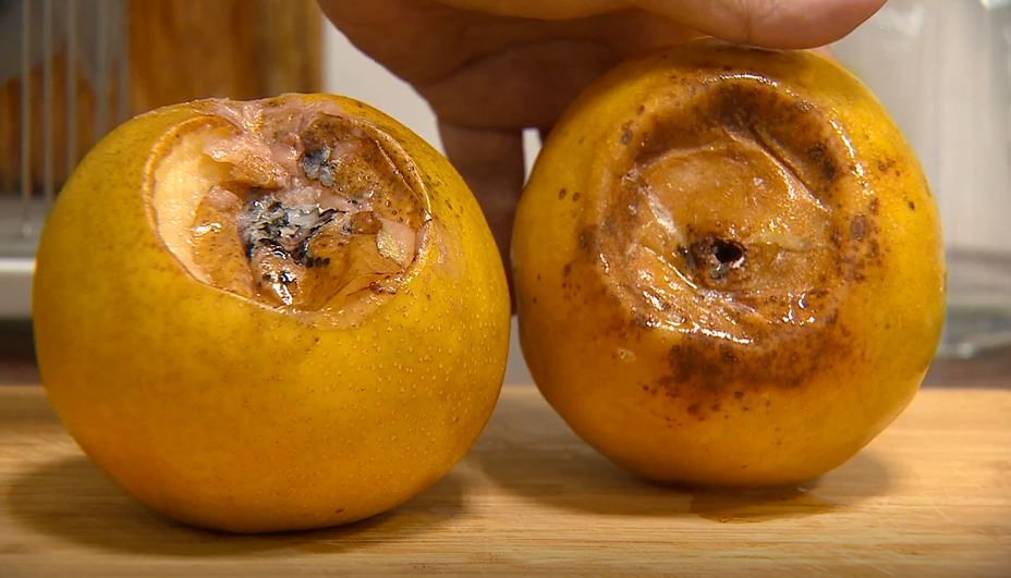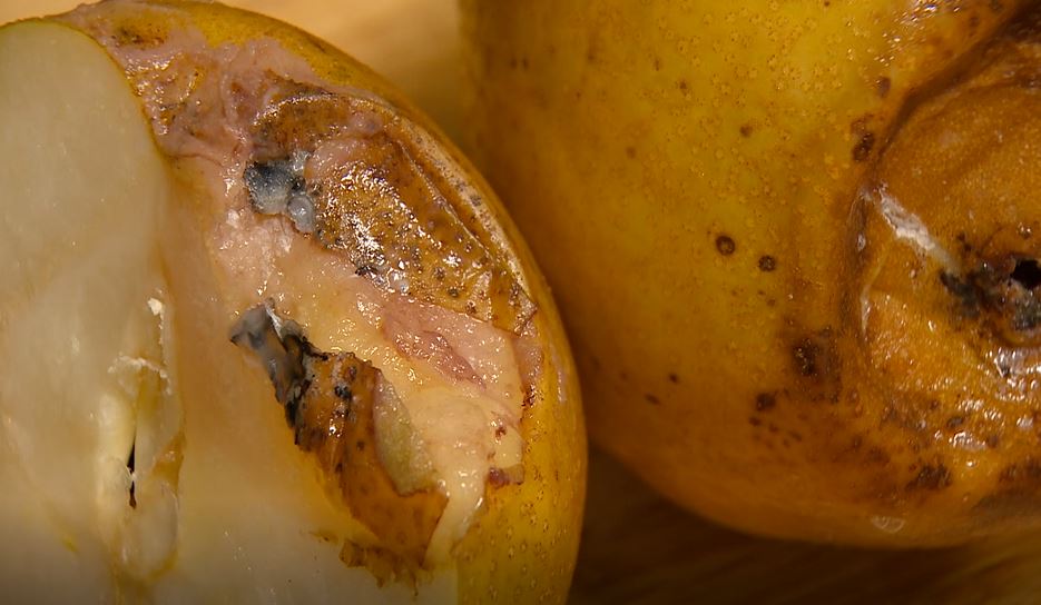 切開一看更是不得了,藍的白的黑的,什麼顏色都有,從外表爛到內部,另一顆,連梨子核都發霉。
