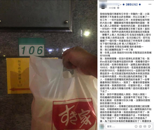 外送員見狀連忙說,「沒關係,你隨便補我200就好」,但這件事還是讓他相當挫折,網友們看了後,也紛紛替他打氣、抱不平,「很過份耶,做人是有多自卑啦?需要這樣侮辱別人來獲取滿足?」、「台灣人消費的觀念變壞了」