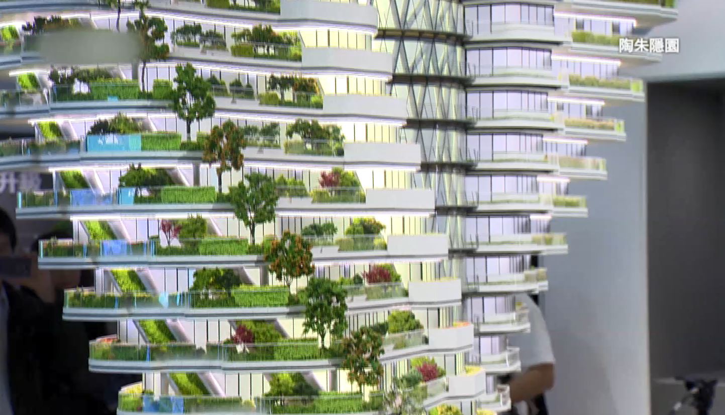 業者:「大樓21層,剛好是旋轉90度。」,陶朱隱園豪宅外觀造型特殊,每層樓旋轉4.5度,因此又有「旋轉豪宅」之稱,是威京集團的亞太工商聯與中華工程合建,緊鄰鴻海創辦人郭台銘住所「信義富邦」。