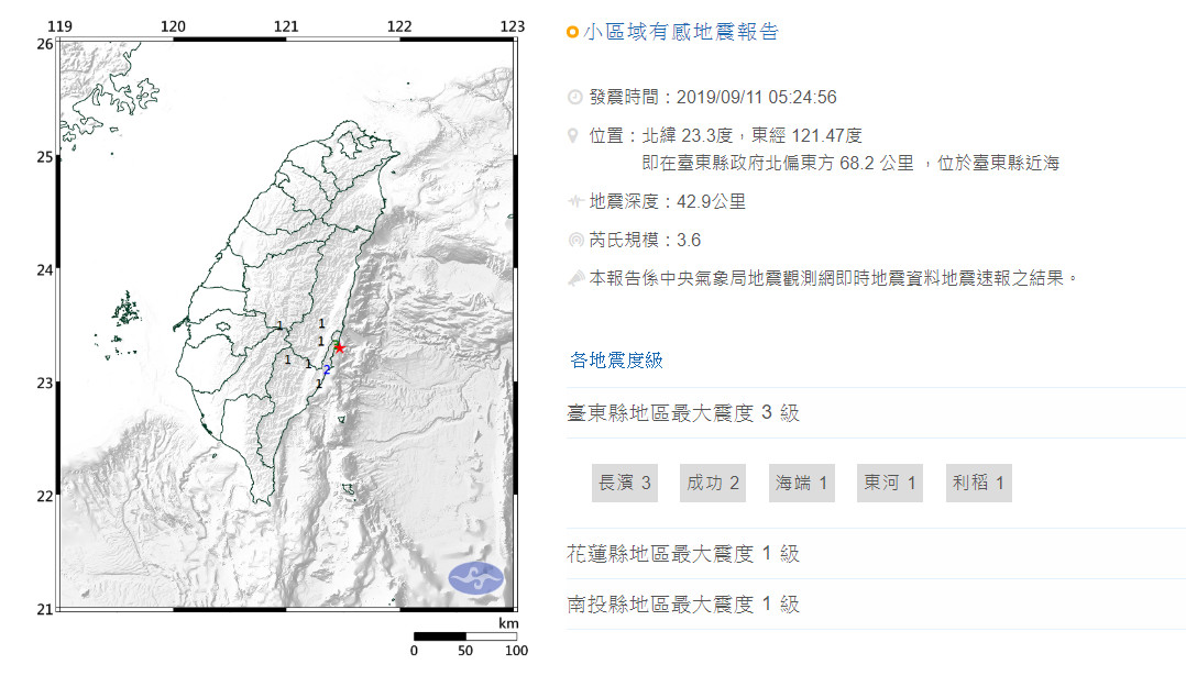 地牛翻身!根據中央氣象局,今(11)日清晨5時24分發生芮氏規模3.6地震,地震深度42.9公里,震央位在北緯 23.3度,東經 121.47度,即在台東縣政府北偏東方68.2公里(位於台東縣近海),最大震度台東縣3級。