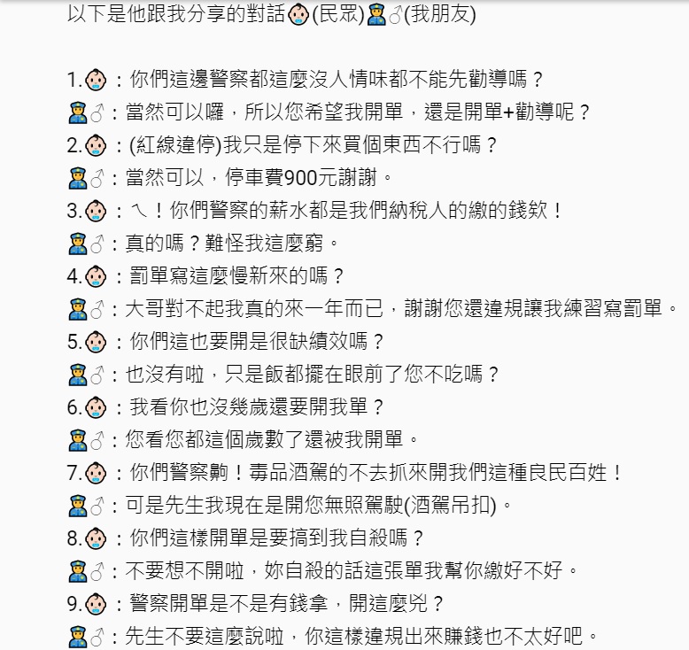 不管在繁忙的交通時段,或在夜深人靜的夜晚,總能在路邊見到波麗士大人路邊執勤,一名網友在Dcard上分享他朋友當警察就職一年的心得,這位警察朋友向他分享遇到「刁民」申訴經驗不斷後,造就了他保持微笑高EQ開單的說話能力,令不少網友覺得對話內容真是神回覆。