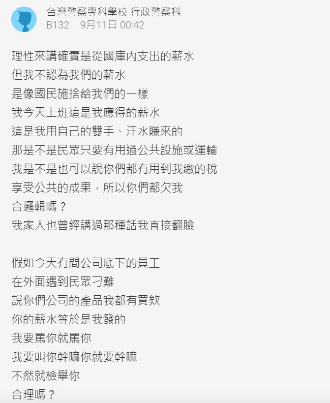 同時也有不少同樣是警察同仁的網友感同身受,在下面留言回應「他敢這麼回,其實早就被投訴了。」還有警察同仁氣憤的表示「我不認為我們的薪水,是像國民施捨給我們的一樣,我今天上班,這是我應得的薪水。」也有同仁無奈的回應「常聽,習慣了」