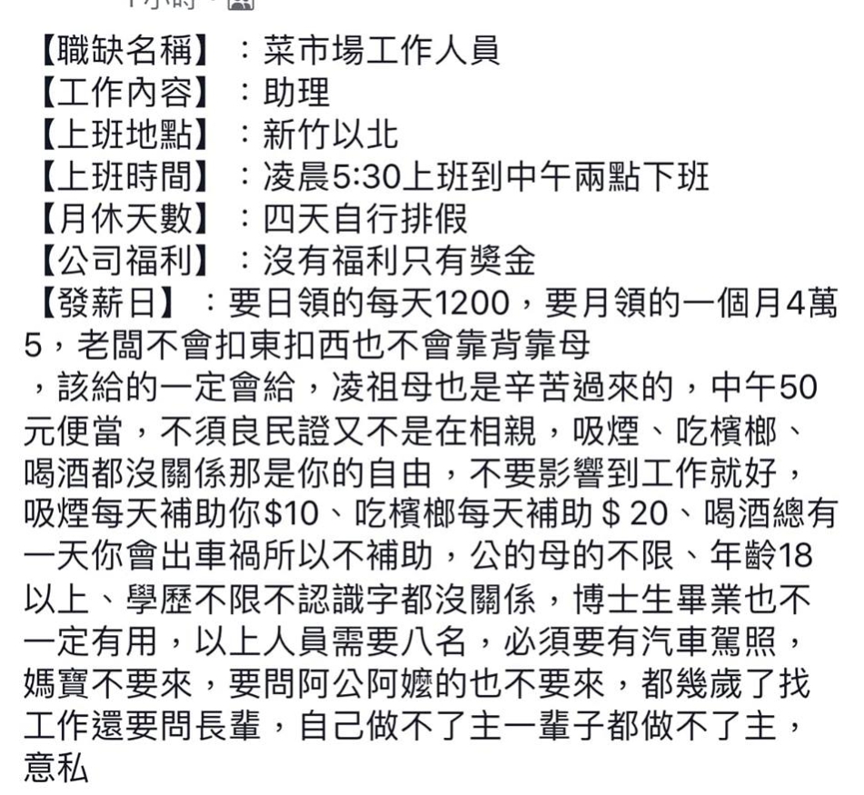 有網友在爆廢公社公開版,分享了一則徵人貼文,老闆總共要找8位菜市場工作人員,上班時間為清晨5點半到下午2點,地點在新竹以北,薪水則是日領1200元,月領4萬5,並載明「沒有福利只有獎金」,每個月可自行排假4天,應徵條件十分寬鬆,只要年滿18歲,具備汽車駕照,性別、學歷都不限,「博士生畢業也不一定有用」。