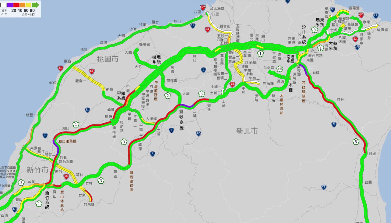 從即時影像來看,今日一早,國1南向新竹湖口到竹北,時速一度不到20公里,中壢轉接二到楊梅時速不到40公里,台北到宜蘭的國5,南港系統至石碇南向路段時速也不到20公里。