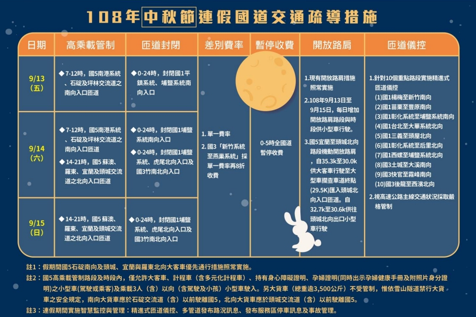 為分散尖峰車流及抑制短途旅次,高公局規劃,13日至15日將實施國5高乘載管制、匝道封閉、單一費率、國3「新竹系統至燕巢系統」採單一費率再8折收費、深夜0-5時暫停收費、開放路肩及匝道儀控措施,用路人可先查詢規劃路線,以避開壅塞路段及時段。