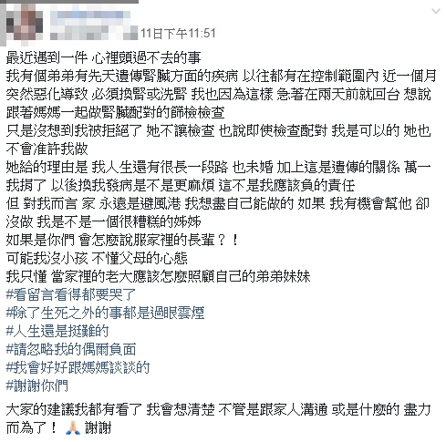 而原PO也向網友坦承媽媽會拒絕的理由,「她不讓檢查,也說即使檢查配對,我是可以的,她也不會准許我做,她給的理由是,我人生還有很長一段路,也未婚,加上這是遺傳的關係,萬一我捐了,以後換我發病是不是更麻煩,這不是我應該負的責任」,但她卻認為,家是永遠的避風港,想盡自己所能的幫助弟弟,也表示自己會再與媽媽溝通。
