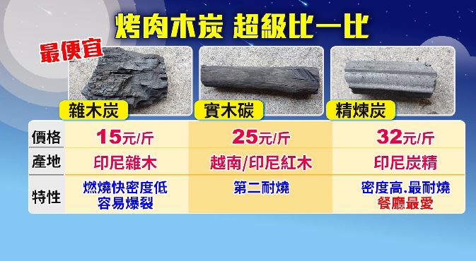 同樣都是木炭,價格高低決定品質好壞,中秋佳節,民眾烤肉可要貨比三家,謹慎挑選。