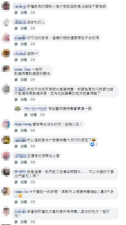也有網友直言,若自家小孩生病,一定會關在家裡,「我女兒腸病毒,我連帶他下樓都不敢」、「我女兒昨天也被醫生診斷為a型流感,馬上跟學校請假整天關在家」、「我兒子B感,我和他都關在家三天了,哪也不敢去」、「我們家的只是感冒就被我關在家了,每天看著他發瘋,可是不能出去散播歡樂,所以只好散播給我跟隊友」。