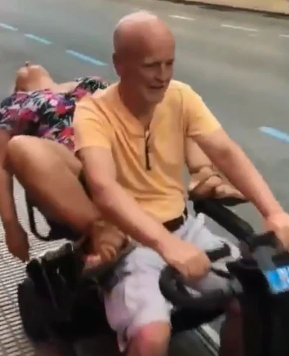 據《THE SUN》報導,這個影片拍攝地點是在西班牙渡假勝地貝尼多爾姆(Benidorm)街頭,當時這名喝醉酒的女子,從一間酒吧被帶走,然後癱倒在一輛電動車的後方。影片中,許多觀光客和不少年輕人在路旁相談甚歡,結果一位開著電動車的光頭伯開處之泰然,面帶微笑,緩緩將車駛像人群,仔細一看,他的後座則是載著一個身穿碎花衣、身材火辣的女子,但她兩腿大開,還露出黑色底褲,嘴巴也睡到張開,完全不顧形象。