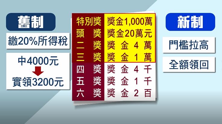 以現行制度來說,只要中了四獎 ,因為超過兩千就得繳20%的所得稅,等於被扣了800元,只能拿到3200元,但今年12月之後超過5000元才需要扣所得稅,未來民眾中了四獎,就可以全額領回家,因此也提醒民眾,如果是在7-8月期,兌中四獎的民眾,別急著領獎,因為兌獎期限是到明年1月,正好跨過新制。