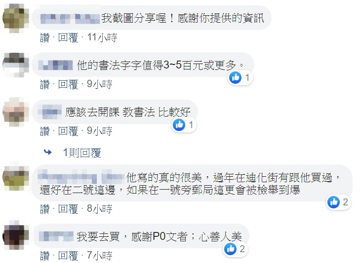 不少網友紛紛留言,「字好好看喔」、「字裡行間多了努力奮鬥不向現實低頭的元素」、「我也向他買一張,親切又字寫得很工整是位優秀的人才,希望有愛心的人多多向他買」、「他寫的真的很美,過年在迪化街有跟他買過,還好在二號這邊,如果在一號旁郵局這更會被檢舉到爆」、「他的書法字值得3到5百元或更多吧」;不過也有不少人對開單的警方感到不滿,但畢竟是警方的職責所在。