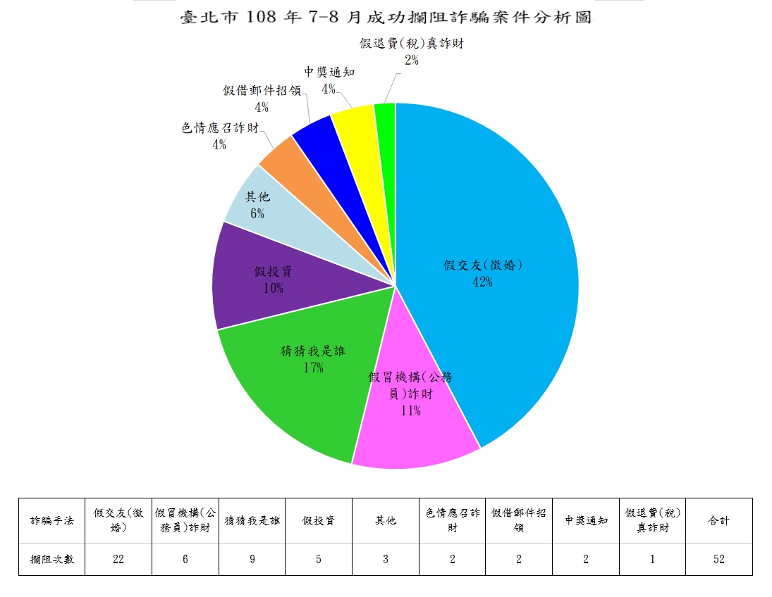 為保障市民財產安全,臺北市警察局長陳嘉昌特別指示轄下各單位與金融機構及各大超商、店家、商號建立暢通聯繫管道,加強宣導詐騙案件關懷提問,並針對協助攔阻有功之人員予以優渥獎勵,經北市警局刑警大隊統計今(108)年7-8月透過金融機構與商家行號成功攔阻詐騙52件,金額高達新臺幣2,839萬餘元,其中又以中國信託商業銀行協助攔阻13件、攔阻金額418萬餘元,成效最為顯著,充分展現出警民合作良好的成果。臺北市長柯文哲特於9月20日治安會報,頒發感謝狀及禮券予攔阻詐騙有功人員表揚其義行。