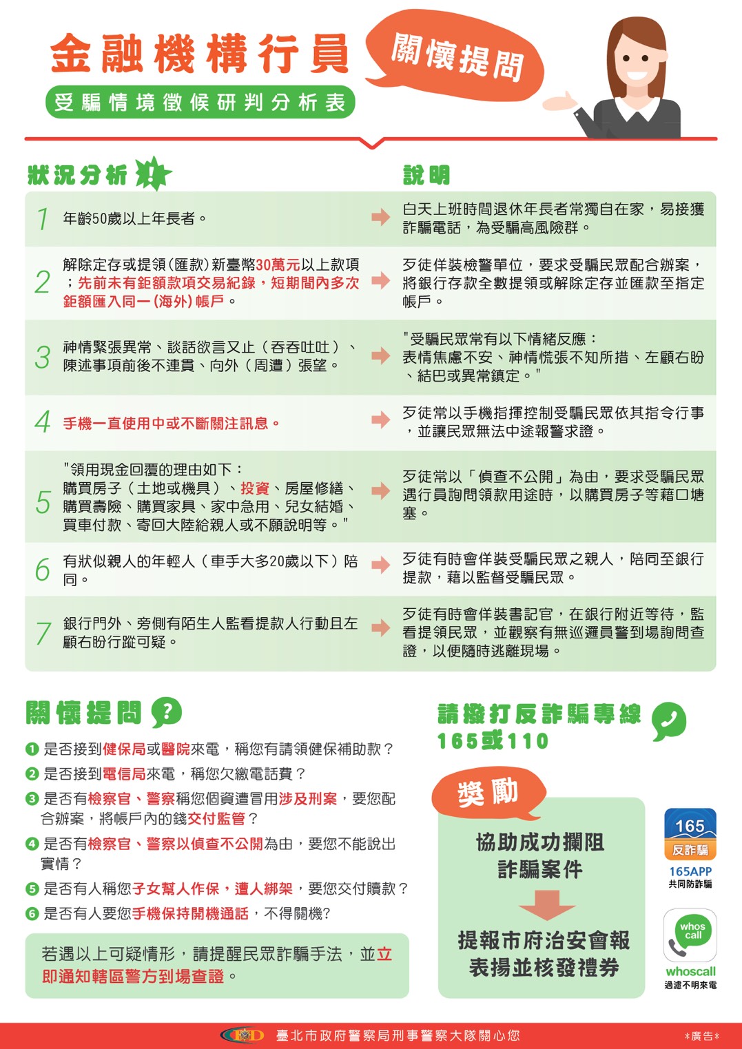 臺北市政府警察局表示:警方防詐工作不因國籍而有差異,除向本國人民宣導詐騙資訊外,對於外國朋友透過宣導手段,保障其財產安全。囿於警力有限,民力無窮,北市警方持續透過金融及超商業者,發現民眾有大額提(匯)款,神情緊張,無法明確說明款項用途、購買大量遊戲點數或疑似遭詐者,請主動關懷提問。並呼籲市民若遇有疑似遭受詐騙情事,可撥打110或165,尋求警方查證,以免受騙。