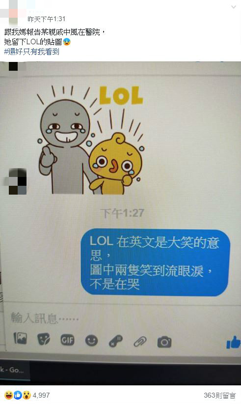 原PO寫下,自己得知某親戚中風住院的消息後,趕緊用臉書訊息通知媽媽,未料媽媽竟然回傳一張「LOL」的貼圖,以為貼圖人物是在難過的哭泣表情,瞬間讓她嚇壞,只好趕緊跟母親解釋「LOL在英文是大笑的意思,圖中兩隻人物笑到流淚,不是在哭」,也忍不住地喊「還好只有我看到」。