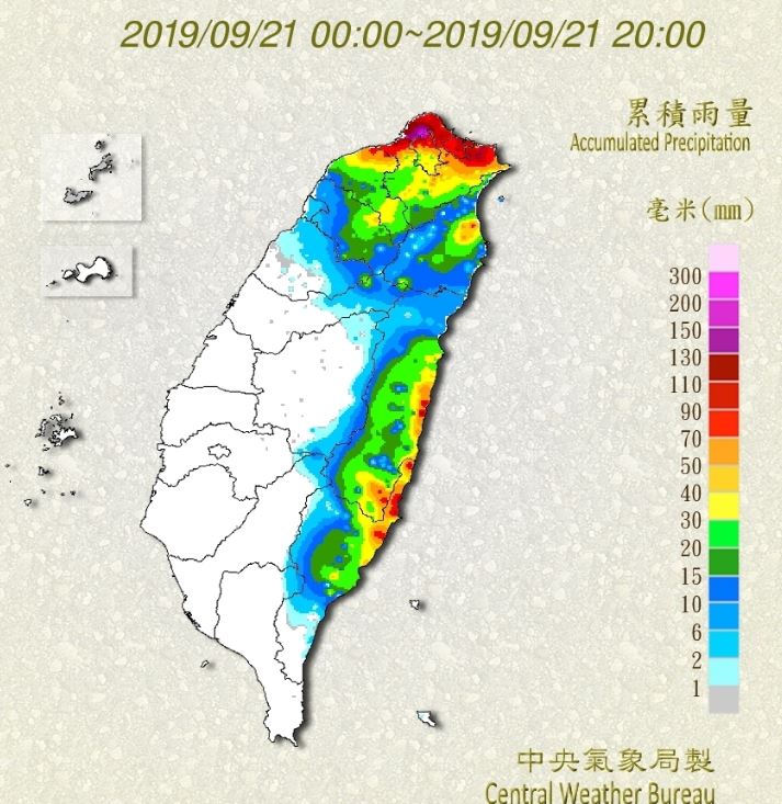 今(21)日受到輕度颱風塔巴外圍環流影響,中央氣象局表示,今(21)日花蓮和台東地區有局部大雨或豪雨發生的機率,大台北山區及宜蘭地區有局部大雨發生的機率,請注意瞬間大雨及強陣風;山區請慎防坍方、落石及溪水暴漲。