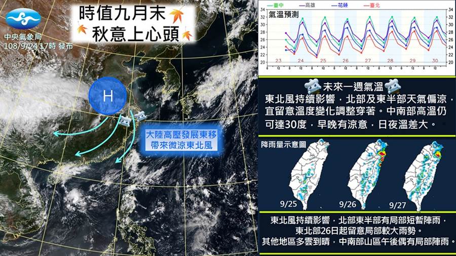 氣象局還表示,氣溫部分,早晚稍有涼意,各地低溫約21到24度,白天北部及東半部較為舒適,高溫約27至30度。中南部仍有32、33度的高溫,中南部日夜溫差稍大,早出晚歸請適時調整穿著。