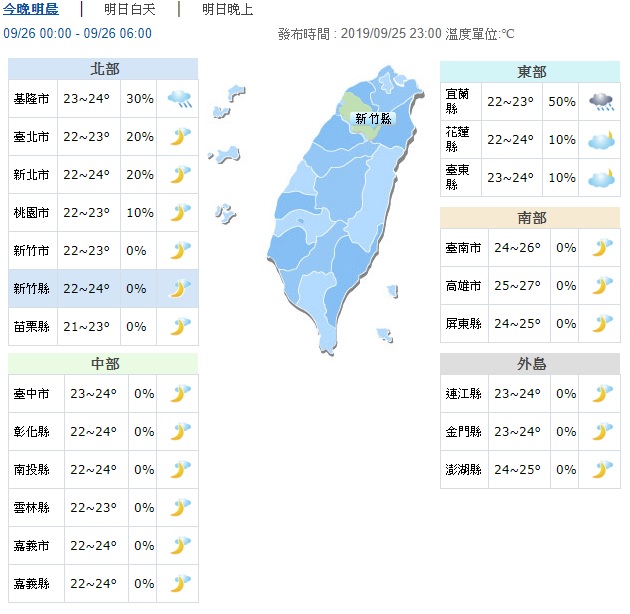 氣象局進一步指出,周四(26日)隨著臺灣東方海面的水氣逐漸移入,迎風面的基隆北海岸及宜蘭將變天,轉為有雨的天氣,尤其晚上之後甚至有局部大雨。周四基隆北海岸及宜蘭將轉為有雨天氣,北部及花東也會有局部短暫陣雨。中南部則依舊是多雲到晴,午後山區有局部短暫陣雨的天氣。