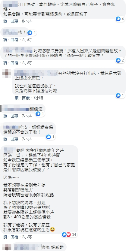 女網友的貼文也引起網友討論,紛紛留言:「碰藥的通常都沒救了,一輩子都這樣進進出出的,辛苦可憐的是老母親」、「能聽進去您就功德無量了」、「之前去會客也是,好幾個都是滿頭白髮的老爸爸老媽媽去看兒子,怕兒子吃不好還都自己煮菜,有夠心疼」、「這個人真是生在福中不知福」、「放不下又沒辦法不管,這種的最無奈、希望他有聽進去你說的、讓阿嬤不要再傷心」,也有網友無奈表示:「很抱歉我必須說,吃藥的人沒救,妳的雞婆只是浪費生命,還有可能引火自焚」、「試問吃藥的人,有幾個能夠逃出毒品的魔掌?」