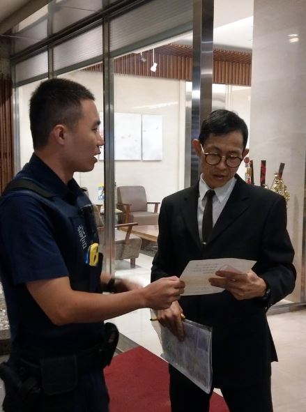 ▼中正第一分局為加強新法宣導成效,近日由各派出所派員至轄內各公寓、大廈發送傳單提醒警衛。(圖/中正第一分局提供)