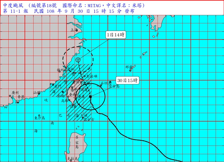 ▼氣象局預估,颱風米塔移動快但不致於成為西北颱,10月1日上午台灣本島可望脫離暴風圈。圖/中央氣象局