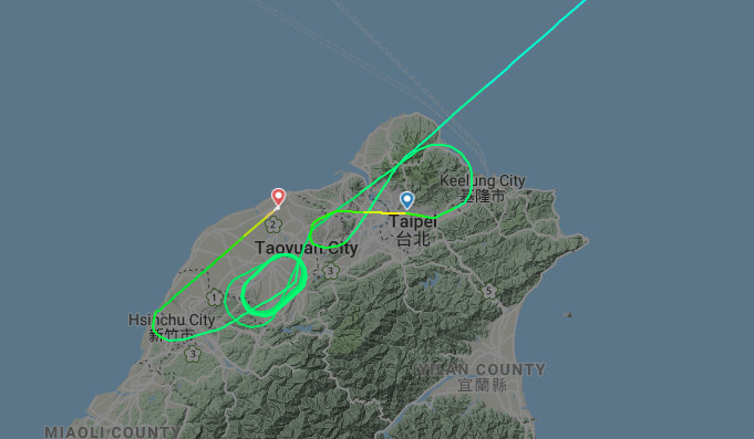 ▼華航颱風天降落松山失敗,上空繞10圈轉降桃機!圖/翻攝flightradar24