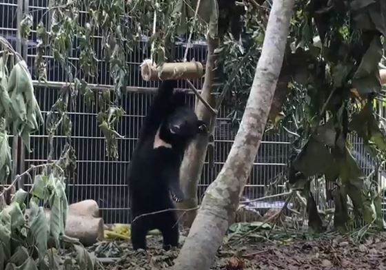 台東林管處日前收容廣原小熊,由於最近又多收容一隻黑熊,林管處刻意不讓牠們同居,另外蓋了一間新的籠舍,模擬野外環境提供小熊更多的野外探索環境,結果牠很快適應,一下泡澡一下拉單槓,就連晚上睡覺都睡到四腳朝天,模樣相當可愛。