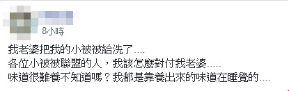 該名網友在臉書社團「爆廢公社」發文,悲傷地透露,老婆前陣子突然把他的小被被拿去洗,等他回到家,看到晾在陽台的小被被,一切都已經太遲了,「各位小被被聯盟的人,我該怎麼對付我老婆」,他強調這條小被被大有來頭,是從哥哥傳到姊姊,最後再到他手中,少說也有30年歷史。