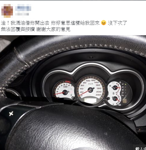 有網友在「爆怨公社」上發文抱怨,朋友跟自己借車,借出去之前,油箱都還是滿的,還回來時卻只剩一格,氣得她PO文「我滿油借妳開出去,妳好意思這樣給我回來,沒下次了」