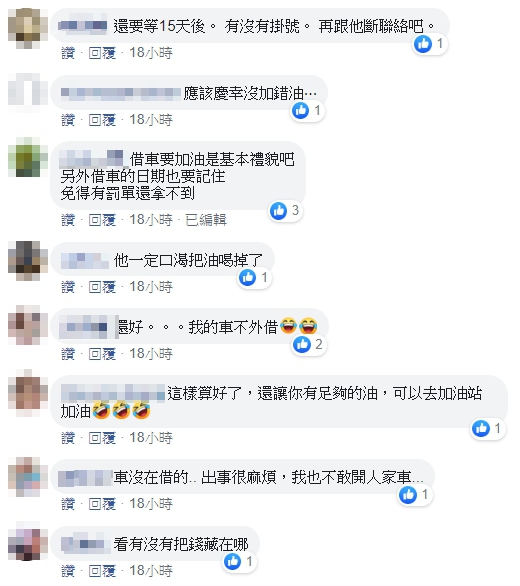 也有網友提醒車子不該隨便借給別人:「車子借非親人開若發生事故,保險是不理賠的,若不想破壞友情,以後要自己想想」、「不是自家人,都別借」、「車能安全回來~就要謝天謝地了,遇到過借車撞壞,修車費還要我出一半的直接放棄這個朋友」。