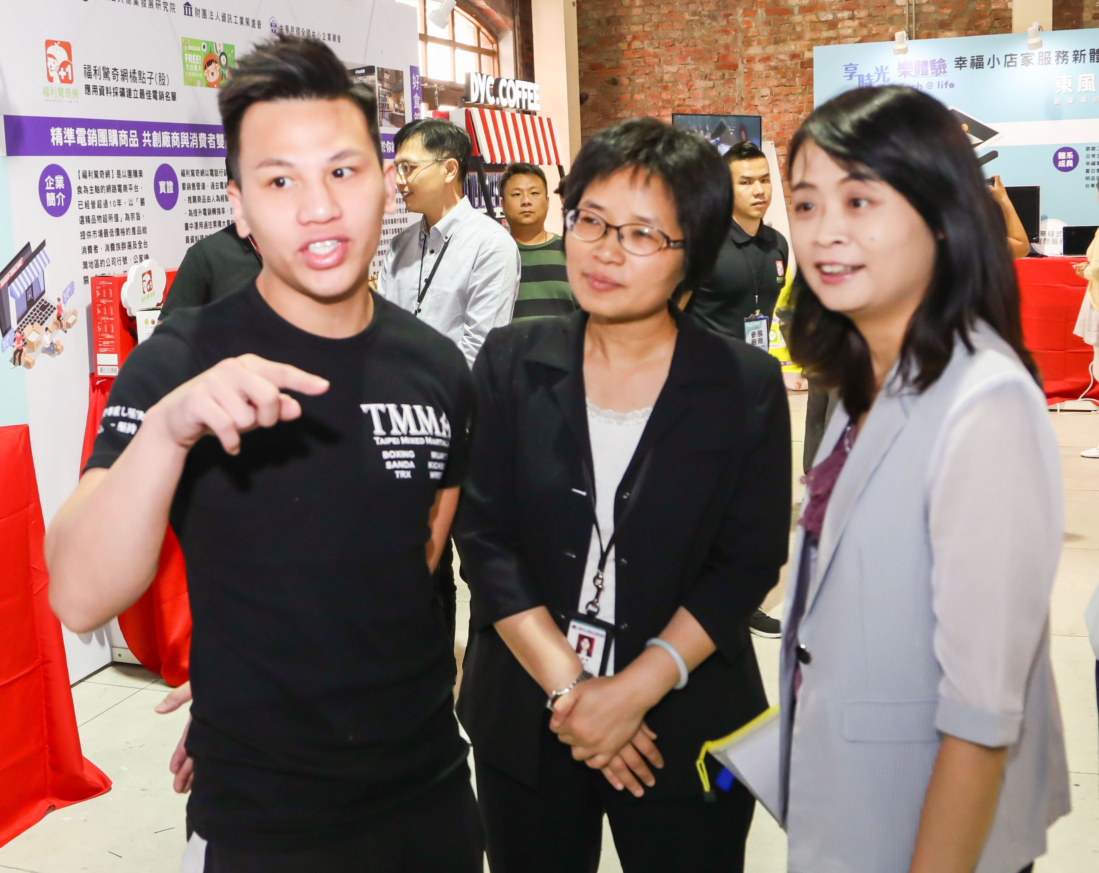 ▲中企處蘇文玲副處長(右)了解運動休閒智慧服務體系,整合32家的運動休閒場館及周邊業者,提供FB智慧預訂服務及聯合行銷