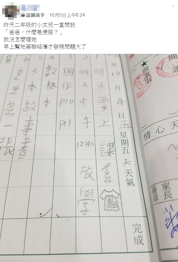 一名父親在《爆怨公社》發文表示:「昨天二年級的小女兒一直問我『爸爸,什麼是便服?』我沒怎麼理她,早上幫她簽聯絡簿才發現問題大了」,畫面上可以看到,原PO女兒在聯絡簿上的代辦事項,寫下「明天要上課,穿便服」,沒想到女兒畫的示意圖,竟然是一件上面印有「大便」圖案的洋裝,似乎無法理解「便服」到底是何物,讓他好氣又好笑。
