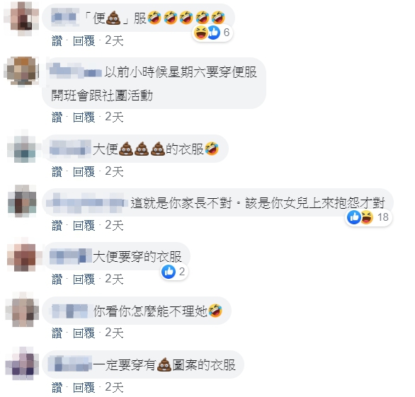 貼文曝光後引發網友討論:「沾到大便的衣服」、「爸爸都去禮服跟制服,便服太貴了會自動忽略」、「我以為是爸爸不方便解釋便服店」「早上才簽聯絡簿是非常危險的事!建議回家後第一時間先看聯絡簿」、「放學帶一套乾淨的衣服去接她」、「我女兒也差不了多少!昨天下午老師用line通知,禮拜六本來是體育服換成便服。下課我去接她,問她明天穿什麼衣服,她回明天不用穿」,網友也很關心:「所以今天女兒有沒有順利去上課」。